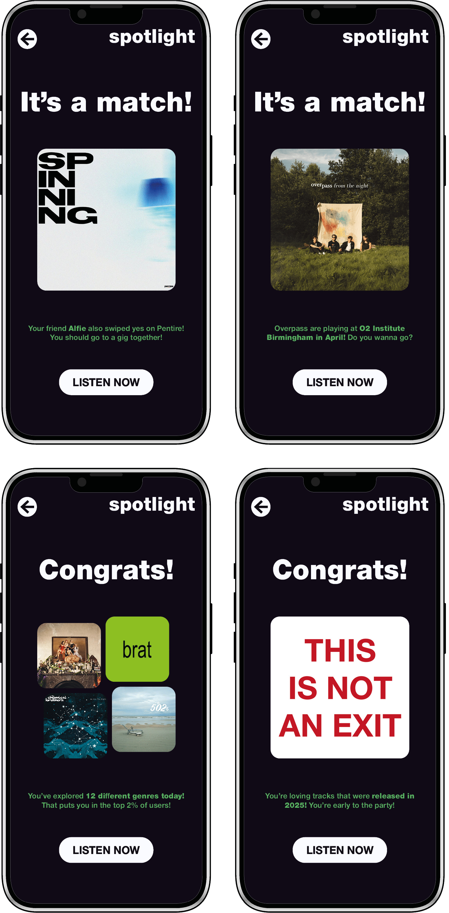Designed with Gen Z’s digital consumption habits in mind, Spotlight features a bold, swipe-based interface similar to online dating apps, making music discovery feel engaging and dynamic, rather than overwhelming. Opportunities to match with artists and compete with friends gamifies the process, encouraging repeated exposure to lesser known artists.