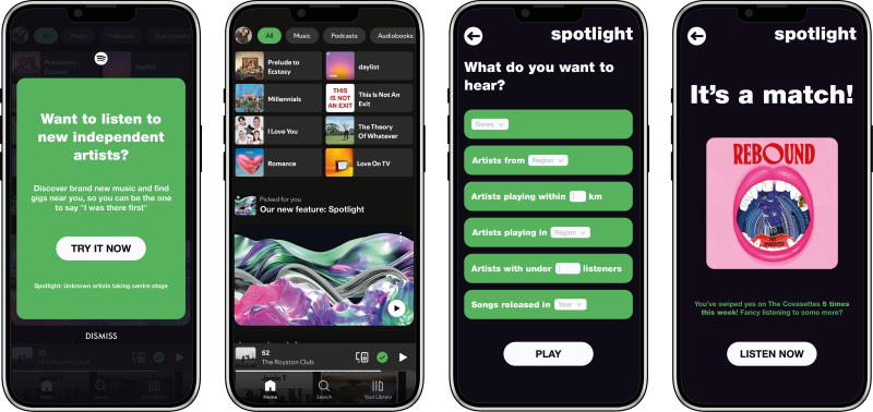 Designed with Gen Z’s digital consumption habits in mind, Spotlight features a bold, swipe-based interface similar to online dating apps, making music discovery feel engaging and dynamic, rather than overwhelming. Opportunities to match with artists and compete with friends gamifies the process, encouraging repeated exposure to lesser known artists.