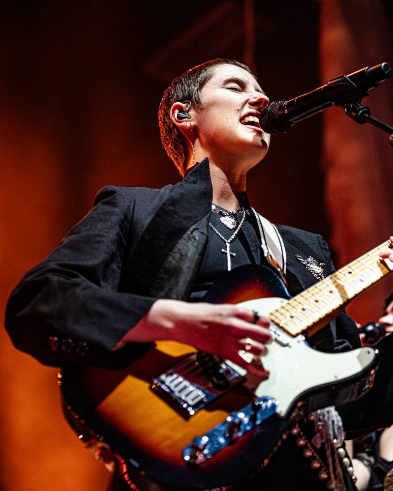At 9pm, The Last Dinner Party - comprised of Abigail Morris, Lizzie Mayland, Emily Roberts, Georgia Davies, and Aurora Nishevci - walked out to enthusiastic screams from the crowd, who were immediately captured by the commanding presence of the band and silenced as the introduction to ‘Agnus Dei’ swelled. Despite the album being released just seven weeks prior, the audience sang the opening track with confidence, their voices rising to meet Morris’. Performing ‘From The Pyre’ in full, along with eight tracks from their debut ‘Prelude to Ecstasy’ and unreleased ‘Big Dog’, The Last Dinner Party filled the vast stage with a mix of choreographed flourishes and spontaneous, free-flowing movement, amplifying their signature theatrical tones. The band took turns talking to the crowd throughout, congratulating Brighton on being the best dressed crowd they’ve seen all tour, and attributing it to “all the gorgeous shops selling gorgeous things” around the city.