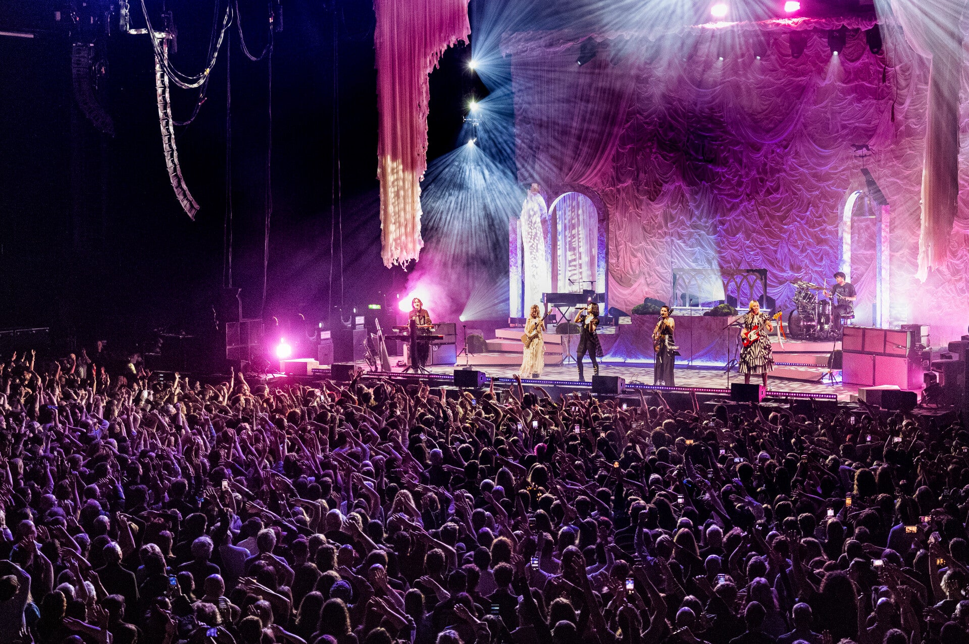 A standout moment of the night came when all five members formed a tight circle at the centre of the stage, delivering the eerie, cult-like harmonies of ‘Woman is a Tree’ with captivating precision. Even amid their professionalism as performers, the façade briefly slipped later on in the set; the band openly giggled at Morris as she fumbled the opening line of ‘Burn Alive’, a crack in composure that only heightened the sense of warmth and intimacy rippling through the arena.